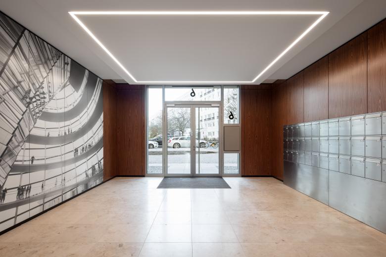 Eine eingeschossige Tiefgarage im Untergeschoss bietet Raum für 41 PKW-Stellplätze, einige davon barrierefrei. Insgesamt wurden für das Gebäude auch 240 Stellplätze für Fahrräder vorgesehen, die sich in den Fahrradräumen im Unter- und Erdgeschoss und oder in den Freianlagen im Hof befinden.