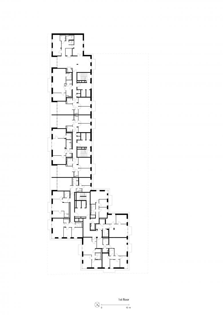Der Wohnkomplex besteht aus einem zehngeschossigen Riegel, dessen Kopf mit zwei weiteren Geschossen turmartig markiert wird. Ein sechsgeschossiger, versetzt angefügter Vorbau führt die Traufhöhe auf das historische Berliner Maß zurück und flankiert an der Barnimstraße die Zufahrt zu einem gemeinsamen Innenhof. Am anderen Ende binden das Erd- und das Obergeschoss den Komplex an den Nachbar an. Außer den Gewerbeeinheiten im Erdgeschoss entstanden hier ausschließlich Wohnungen.
