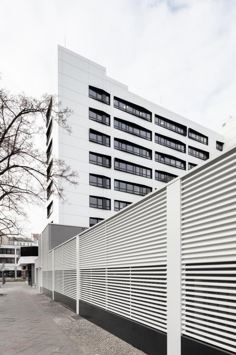 Die neue, hinterlüftete, vorgehängte Fassade besteht aus großformatigen, hochwetterfest pulverbeschichteten, weißen Aluminiumblechkassetten. Gegliedert werden diese durch weit auskragende, aus Aluminium-Strangpressprofilen individuell gefertigte Leibungskästen der Fenster. Die neuen, thermisch getrennten und hochwärmedämmenden Aluminium-Drehkippfenster bzw. Festelemente entsprechen optimal den aktuellen Anforderungen an Wärme- und Schallschutz. Die eingeschossige Fassade des Parkhauses zur Wilhelmsaue wurde mit vorgeblendeten Aluminium-Lamellen verkleidet und erhielt eine Farbgebung analog zur Hauptfassade. Auf dem Dach von Bauteil 3 wurde eine ca. 145 m² große Dachterrasse errichtet.