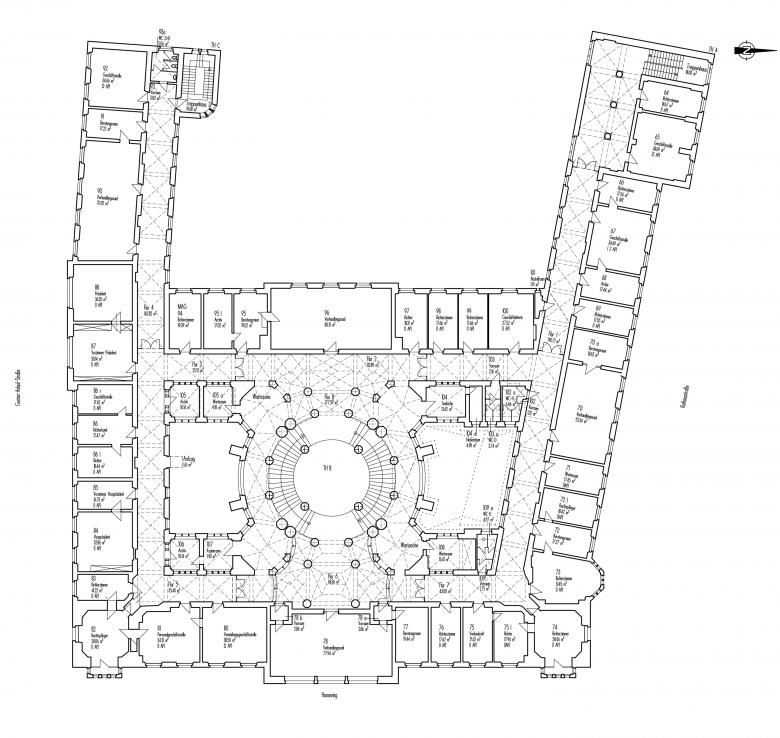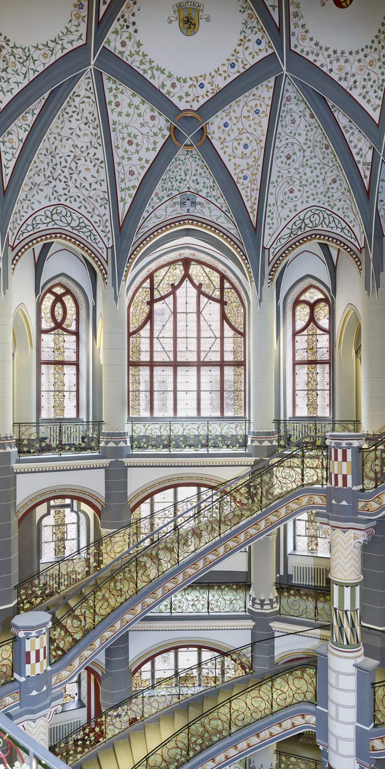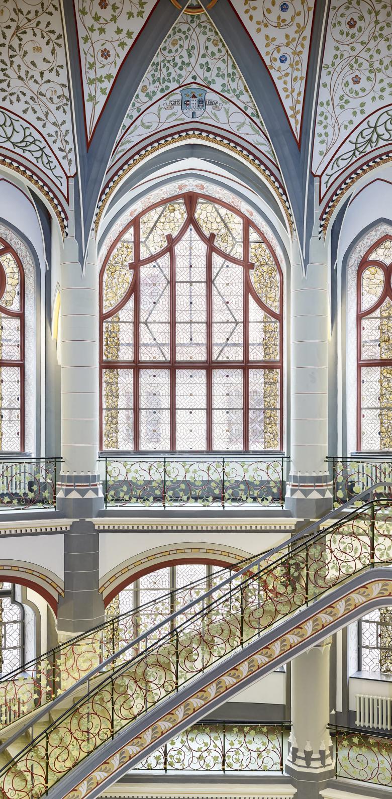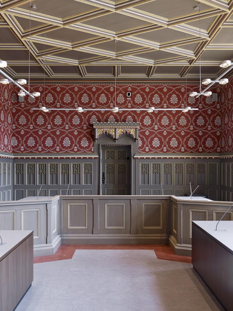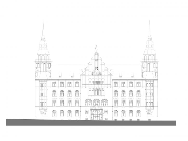 Erscheinungsbild außen und in ausgewählten Bereichen innen wiederherzustellen. Der Fokus lag einerseits auf der Wiederherstellung der Fassaden, Fenster und Türen sowie auf ausgewählten öffentlich zugänglichen Räumen, insbesondere auf dem Eingangsbereich und dem Haupttreppenhaus, den Treppenhäusern, Fluren und einigen Verhandlungsräumen.