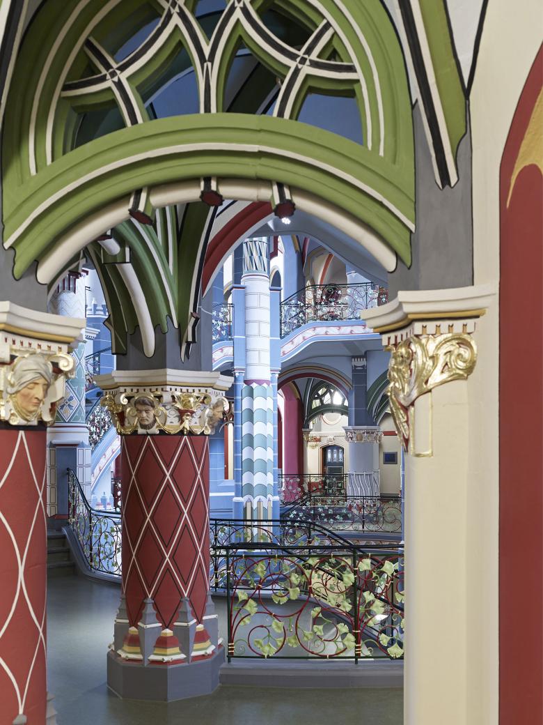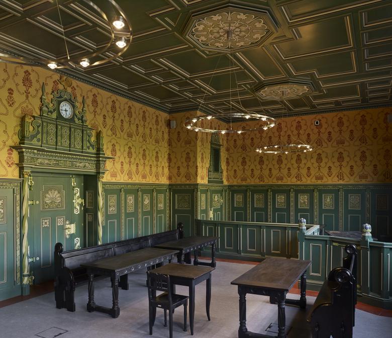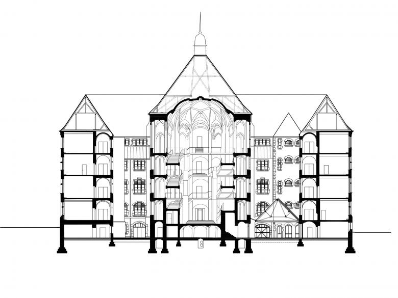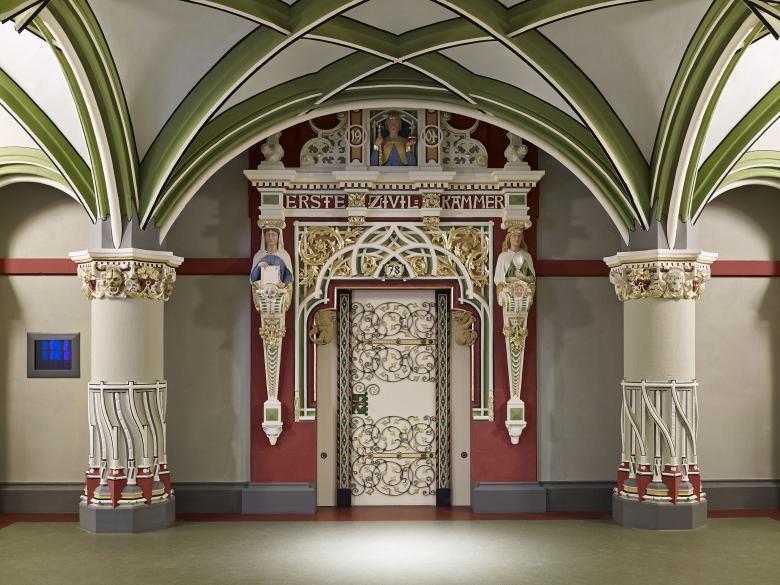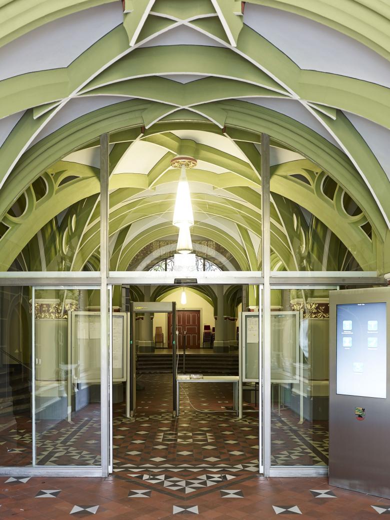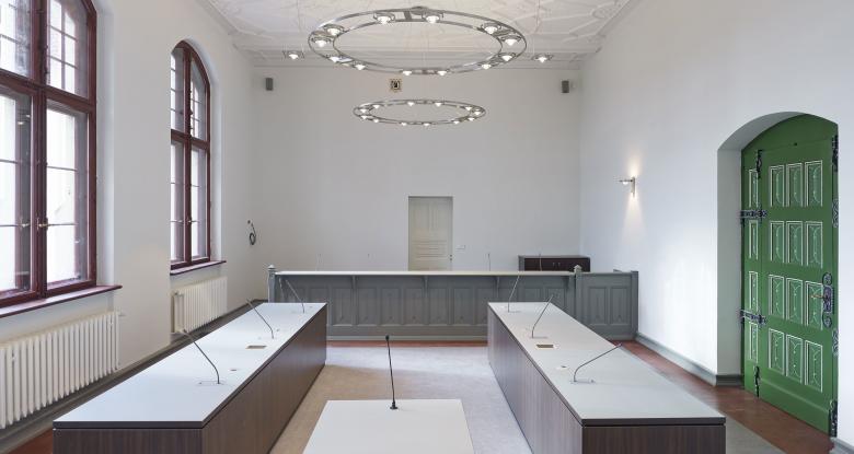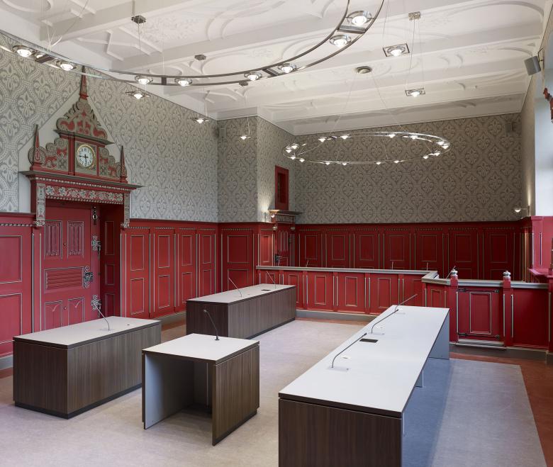 Erscheinungsbild außen und in ausgewählten Bereichen innen wiederherzustellen. Der Fokus lag einerseits auf der Wiederherstellung der Fassaden, Fenster und Türen sowie auf ausgewählten öffentlich zugänglichen Räumen, insbesondere auf dem Eingangsbereich und dem Haupttreppenhaus, den Treppenhäusern, Fluren und einigen Verhandlungsräumen.