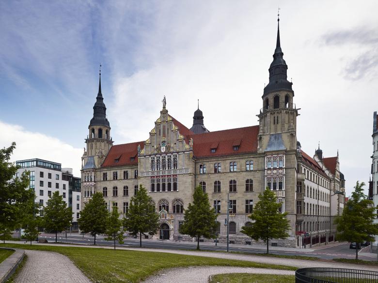 Das Gerichtsgebäude in Halle wurde zwischen 1901 und 1905 als mächtiger, das Stadtbild prägender viergeschossiger Bau errichtet. Innen und außen befinden sich zahlreiche Bauverzierungen im Stil der späten Gotik und Frührenaissance. Das Haupttreppenhaus ist als steile, gewölbte Kuppelhalle gestaltet. Dieses Baudenkmal zählt zu den aufwendigsten und architekturgeschichtlich bedeutendsten Justizpalästen der Wilhelminischen Zeit. Zugleich ist es ein Teil eines städtischen Denkmalbereichs. Ursprünglich als Zivilgericht errichtet, wird der Gebäudekomplex heute als Landgericht genutzt.