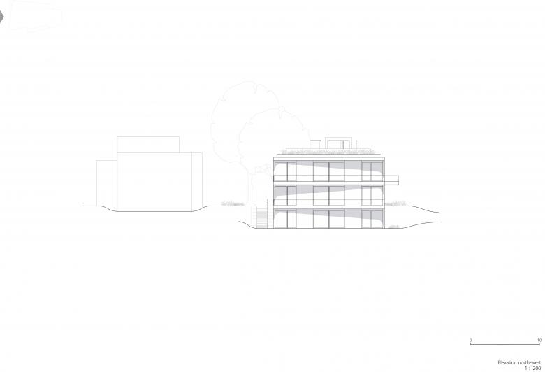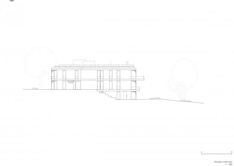 Die Räume im Gartengeschoss erhalten direkten Zugang über eine außenliegende Treppenanlage an der nord-östlichen Gebäudekante. Alle weiteren Wohnbereiche werden über das zentrale Treppenhaus im Haupteingang erschlossen. An die Aufenthaltsräume schließen großzügige Terrassenflächen an. Darüber hinaus ist der größte Teil des Flachdachs der Terrassennutzung vorbehalten, teilweise als Dach mit intensiver Begrünung und teilweise als Holzdeck ausgeführt.