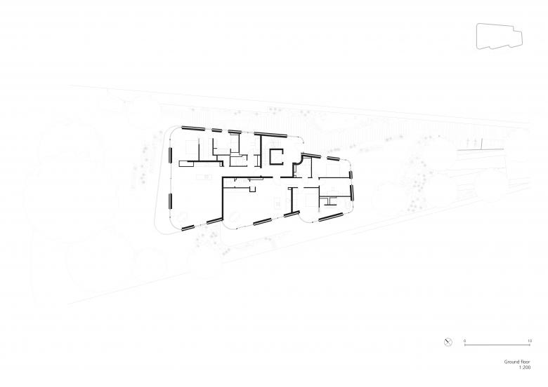 Das Gebäude orientiert sich volumetrisch an der Geometrie des Grundstücks und weitet sich ebenfalls in Uferrichtung auf. Die Form des Gebäudes ist mit schwungvollen Rundungen abgestuft, welche dem Baukörper eine optische Gliederung verleihen. Die Höhe des Gebäudes sowie die Anordnung der Etagen