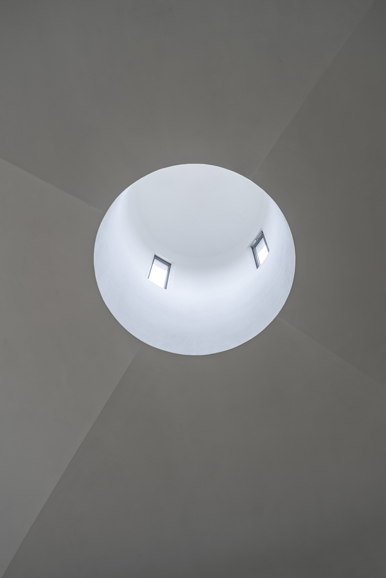 Im Inneren finden etwa 200 Menschen Platz: Nach dem Passieren eines halbrunden, innenliegenden Vorraumes steht der Besucher im schlichten, ruhigen Innenraum fast unmittelbar unter der gekälkten Kreuzkuppel und blickt nach oben in den Zylinder der hellen Dachlaterne.