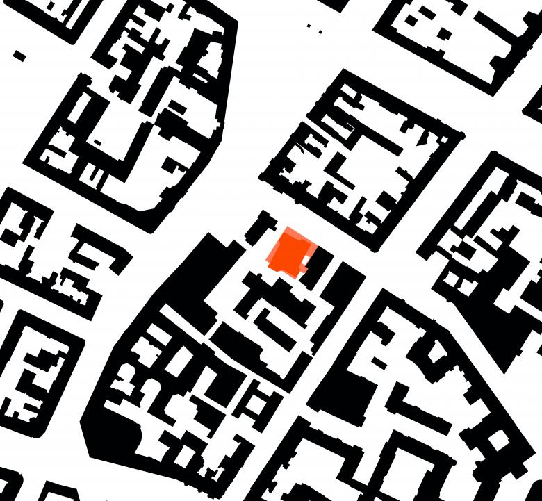Die Fassaden der ersten bis fünften Obergeschosse bestehen aus sägezahnartig geschuppten, bodentiefen Fenstern in einem dunkel gehaltenen Aluminium-Rahmenwerk. Die Torsion der aufgehenden Geschosse mit unterschiedlich orientierter Schuppung der Fassade und alternierend ausgreifenden doppelgeschossigen Erkern unterstreicht die sichtbeziehungsstärkende Drehungsfigur des oberen Gebäudeteils. Die Drehung sowie der Rücksprung der Gebäudevolumen schaffen eine gewisse Leichtigkeit und würdigen durch die entstehenden Sichtachsen den Gebäudebestand. Je nach Perspektive spiegeln sich die historischen Fassadenfronten der gegenüberliegenden Straßenseite in den Fensterfronten, ein kalkuliertes optisches Spiel, das den Neubau in einer visuellen Liaison aus alt und neu als harmonischen Bestandteil einer gewachsenen historischen Zeile erscheinen lässt.