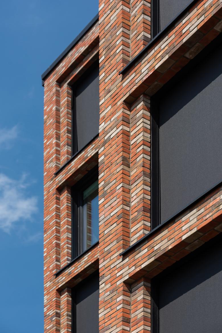 Die Fassade des Büroteils im Gegenzug ist vertikal durch fortlaufende Klinkerbänder in rot-braunem Farbmuster gegliedert. Durch horizontale Klinkerstege in jedem zweiten Geschoss wird hier eine doppelte Geschossigkeit der Büroetagen suggeriert. Die regelmäßige Anordnung der fast quadratischen Fensterfelder gibt der Fassade einen ruhigen, großzügigen Charakter und zitiert die Gestaltung industrieller Lofts.