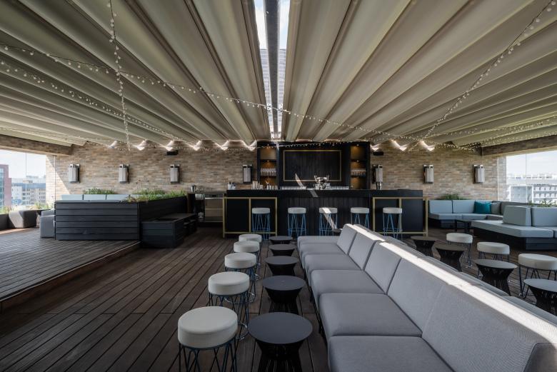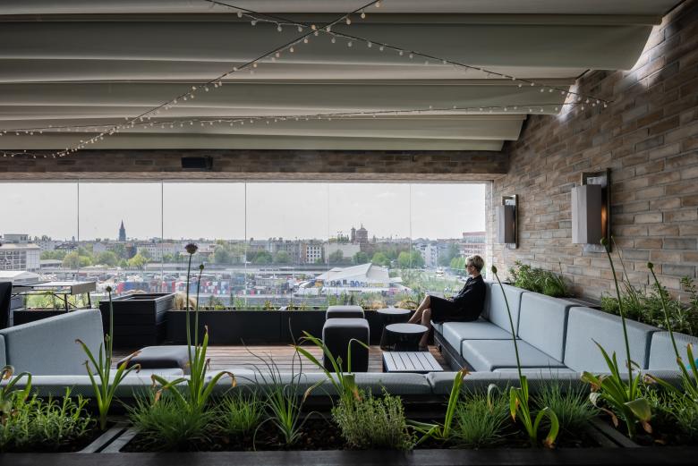 Der Hauptzugang zur Hotellobby erfolgt vom Stralauer Platz, sowie über einen weiteren Eingang im „Spreefenster“. Neben den 174 Zimmern, dem Konferenzbereich für ca. 152 Personen und der Hotelbar mit einem separaten Eingang im Erdgeschoss, wurde eine extensiv begrünte Südterrasse mit Zugang zum Frühstücksraum realisiert. Das oberste Geschoss verfügt über eine Dachterrasse mit der 131 m² großen ,,Sky-Bar‘‘. Die weiteren Terrassenflächen im ersten und sechsten Obergeschoss sind als nicht-begehbare Gründächer ausgeführt. Der Zugang zum Bürogebäude mit Lobby und sechs Büroetagen erfolgt ebenfalls direkt vom Stralauer Platz. Die Geschosse wurden hier mit einer lichten Höhe von ca. 3,05 m realisiert und ermöglichen die flexible Nutzung als Großraumbüro, Zellenbüro oder als Mischform. Die nicht-begehbaren Dachflächen sind hier ebenfalls begrünt und die östliche Dachfläche im ersten Obergeschoss, sowie die Dachfläche im fünften Obergeschoss sind als begehbare Terrassen für Büromitarbeiterinnen und -mitarbeiter ausgelegt.