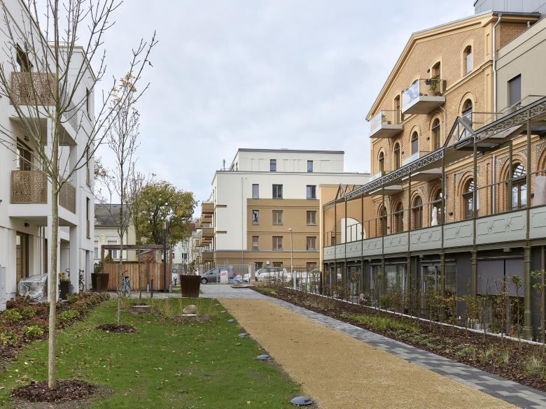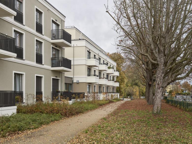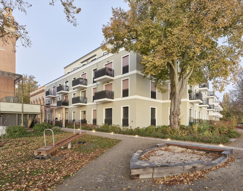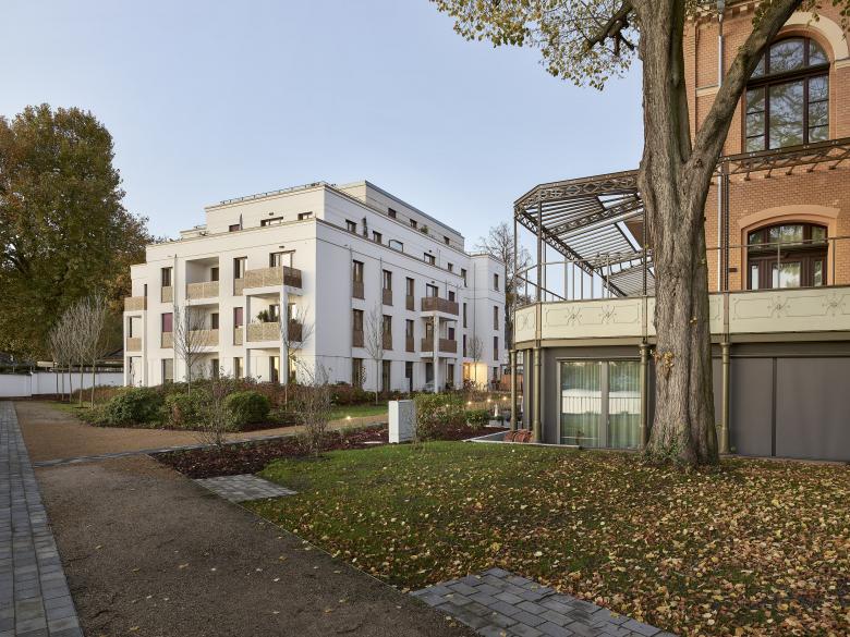 Südlich des historischen, sanierten und umgenutzten Gesellschaftshauses entstand ein weiterer Neubau, der die Geschossigkeit sowie einige Gestaltungselemente des U-Förmigen Nachbargebäudes aufnimmt. Hier sind allerdings die Gesimse flächiger gehalten. Es wurde eine monochrom weiße Farbigkeit der Putzfassaden mit farbigen Akzenten durch textilen Sonnenschutz und die Schlosserelemente gewählt. Dieser Bereich wird ausschließlich für Wohnen genutzt.