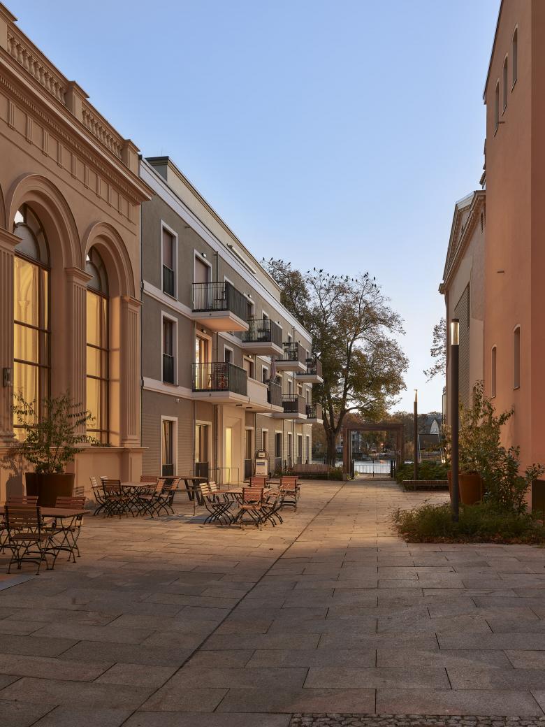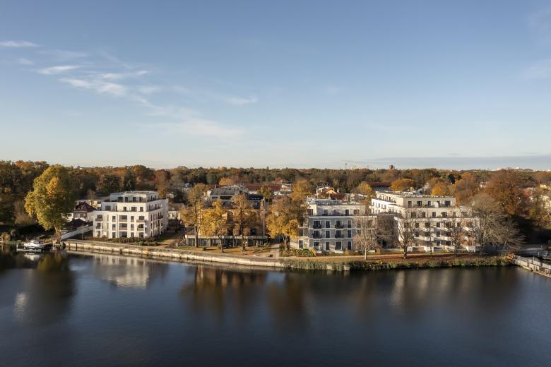 Das Neubauprojekt Vitalresidenz Riviera befindet sich in idyllischer Lage an der historischen Olympia-Regattastrecke in Berlin-Grünau, eingerahmt von einer gepflegten Gartenanlage mit Uferweg. Unter Erhalt des historischen Riviera-Ballsaals und der Fassade des ehemaligen Gesellschaftshauses Grünau, beide aus dem ausgehenden 19. Jahrhundert, entstand auf dem Grundstück an der Dahme und einem straßenseitigen Grundstück an der Regattastraße eine moderne Seniorenanlage mit über 200 barrierefreien Wohnungen. Zur Wasserseite wurden von TCHOBAN VOSS Architekten zwei Neubauten geplant, zwei weitere auf dem landseitigen Grundstück. Mit ihrer Architektur führen die vier Häuser durch differenzierte Fassaden die gestalterische und typologische Heterogenität der Nachbarschaft bewusst fort. Für die aufwendige Sanierung der denkmalgeschützten Bestandsgebäude zeichnen sich van geisten.marfels architekten aus Potsdam verantwortlich.