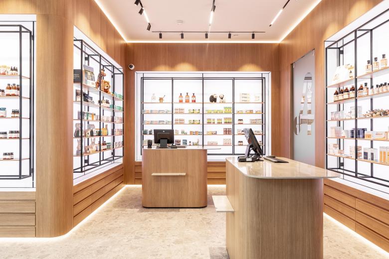 Die Innenarchitektur referenziert auf die Bestandmöbel im Altbau der Apotheke, indem die gediegene Holzoptik aufgenommen und zeitgemäß interpretiert wird. Die Rückwände der Möbel sind als große LED Screens ausgeführt und können damit in allen Farben die Gesamtszenerie bestimmen.
