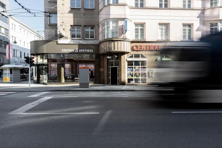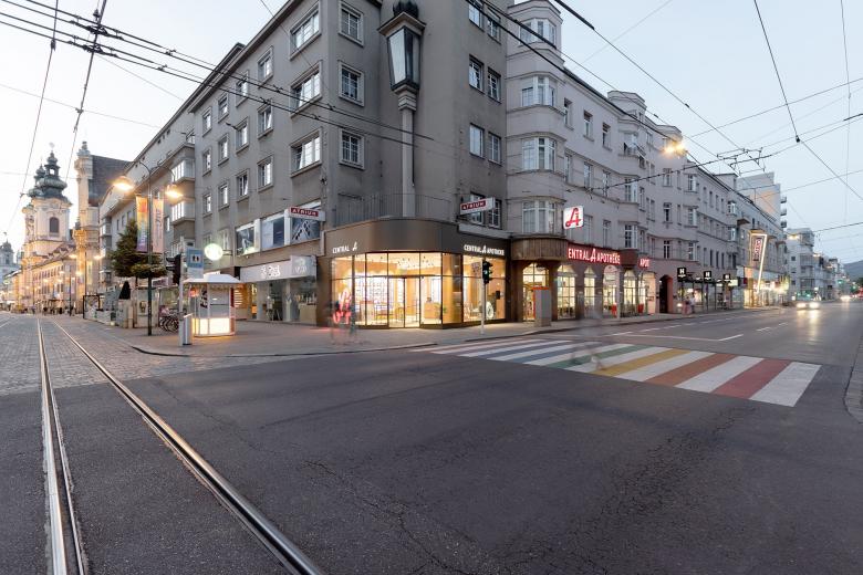 Die Ecke Landstraße/Mozartstraße ist die meistfrequentierte Kreuzung Oberösterreichs. Nachdem das Ecklokal frei wurde, hat die benachbarte Apothekerfamilie die Chance genutzt, ihre Apotheke zur Mozartkreuzung hin zu erweitern.