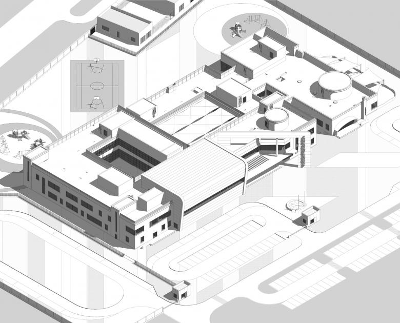 The layout derives by prototype project for Schools for UAE developed by UPA Italia by Paolo Lettieri Architects and UPA in JV with General Planning in 2009. The original project of School for C1 Cycle was developed for 1000 students. MOID built several of these across all UAE. In 2016 MOID decided to update the design of the school prototype including a small kindergarten and other functions for special needs students. The Minister himself wanted the project to be the first one designed in BIM.