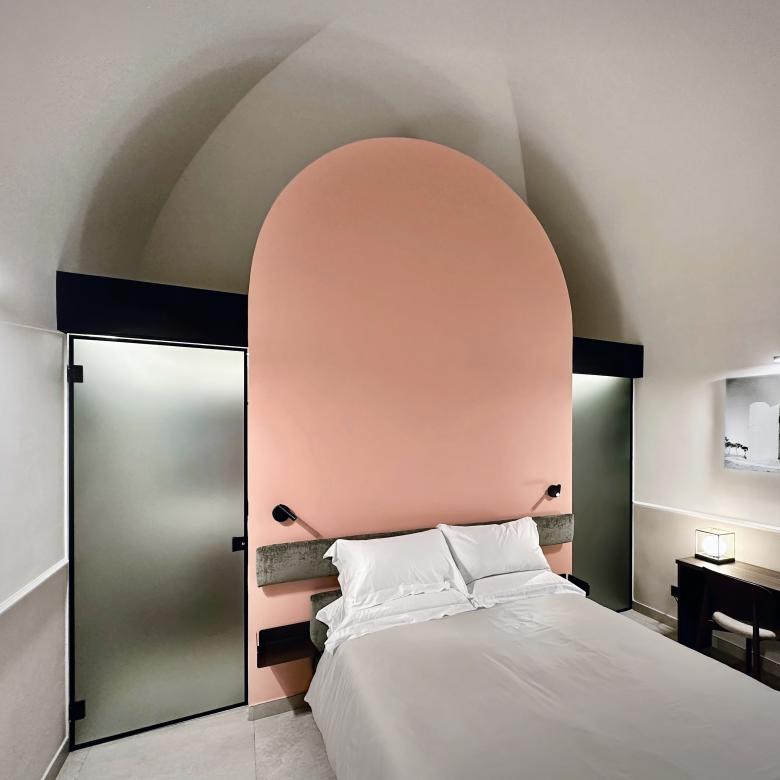 The interior layout was also rethought with the goal of keeping the original architectural configuration visible and usable. The six guest rooms and their en-suite bathrooms were created through targeted interventions. Auxiliary spaces were carved out by inserting new partitions in a clearly recognisable way, ensuring that the legibility of the existing spaces, especially on the ground floor with its vaulted ceilings, remained intact.