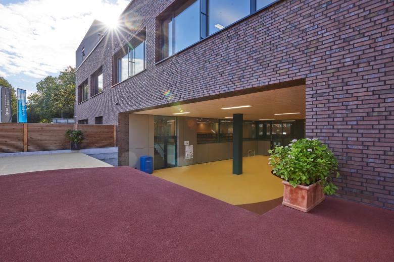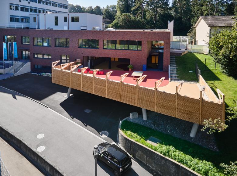 Als ein neues ortsprägendes Element wird eine Terrasse Richtung Sportplatz mit einer bewachsenen pergola-artigen Brüstung gestaltet – als Kombination dient die Terrasse als überdeckte Vorfahrt der internationalen Schule. Die ehemaligen Autoeinstellhalle öffnet sich im vorderen Teil und ermöglicht einen grosszügigen gedeckten Aussenbereich. Die Umgebung wird auf 3 Seiten komplett neugestaltet und naturnah mit Spielflächen ausgebildet.