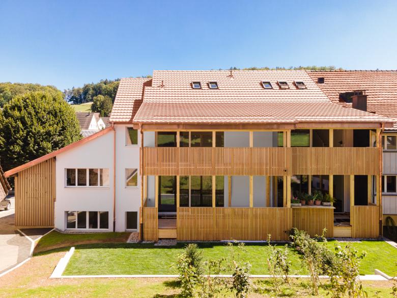 Das bestehende, zum Ortskern gehörende Haus, wurde bis auf sei-ne Aussenmauer abgebrochen und neu erstellt. Das Mehrfamilien-haus wahrt die charmante Fassade zur Strassenseite, bietet auf der Rückseite ansprechende Aussenflächen und überzeugt mit einem modernen und zeitlosen Innenausbau. Insgesamt entstehen vier Wohneinheiten mit 3.5 bis 4.5 Zimmern. Zwei Wohnungen befinden sich im Obergeschoss mit Zugang vom Balkon in dem privaten Gartenanteil. Zwei weitere Einheiten werden als Maisonettewohnungen im Dach-/ Dachspitzgeschoss ausgebaut und verfügen ebenfalls über je einen überdachten Balkon. Im Erdgeschoss des Hauses befinden sich die Bewohner- und Besucherparkplätze, die Kellerräume sowie zwei Hobbyräume.