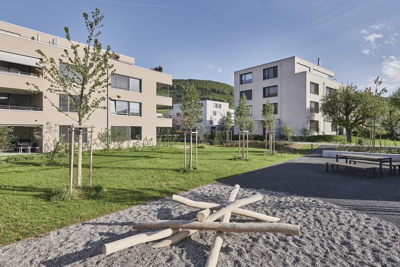 Die drei Neubauten fügen sich harmonisch in die umliegenden Gebäudestrukturen ein und erlauben aus gegebener Distanz den Blick auf die Kirche St. Peter und Paul.