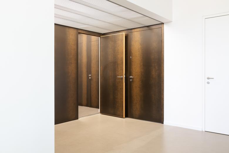 Nach frei werden des dritten Obergeschosses und dem Rückbau der haustechnischen Installationen sowie der Schadstoffsanierung trennten wir das bisher durchgängig genutzte Geschoss in zwei Mieteinheiten. Der jeweilige Grundausbau im Auftrag der PSP Swiss Property AG beinhaltete den Einbau einer Raumschicht mit WC-Anlagen, Dusche, Serverraum und Eingangsbereich. Das Konzept der einfachen, aber robusten Materialwahl haben wir auch hier angewendet. Die Türen und Trennwände in den WC-Anlagen sind aus Schichtstoffplatten, die Decken in Streckmetall mit dahinter liegender Beleuchtung.