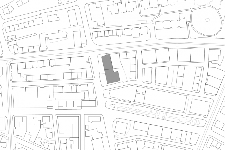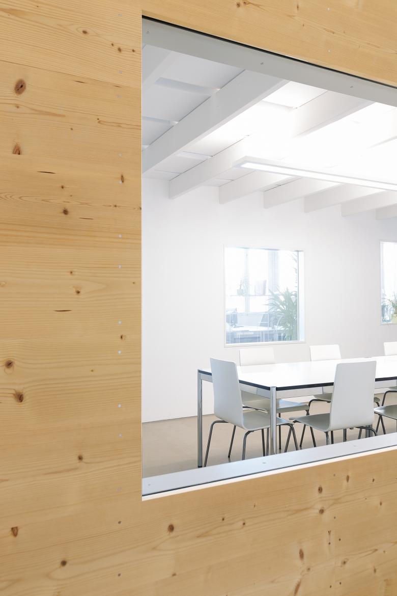 Im Frühjahr 2012 übernahmen wir die leerstehende Mietfläche im Erdgeschoss als unseren neuen Bürostandort. Die vorgefundene Rohheit des Skeletbaus und die grosszügige Raumhöhe von 4 Metern vermittelten einen fast industriellen Charakter, welchen wir erhalten wollten. Mit einfachen Gipswänden trennten wir vom Grossraumbüro Flächen für die Sitzungszimmer ab. Die bestehenden Wandflächen und die rohe Betondecke sind weiss gestrichen. Für die Verbesserung der Raumakustik sorgen drei Deckensegel aus gebundenen Holzwollplatten. In ihrer Struktur und Grösse passen sie sich dem Schalungsbild der Betondecken an. Die Bodenfläche ist mit einem selbstnivellierenden Ausgleichsbelag übergossen und gewachst. Patina, Risse und Verfärbungen geben dem Bodenbelag eine eigene Identität. Einzig im Eingangsbereich zeichnen wir mit den übergrossen, eichengefassten Schiebetüren eine sanfte Noblesse aus.