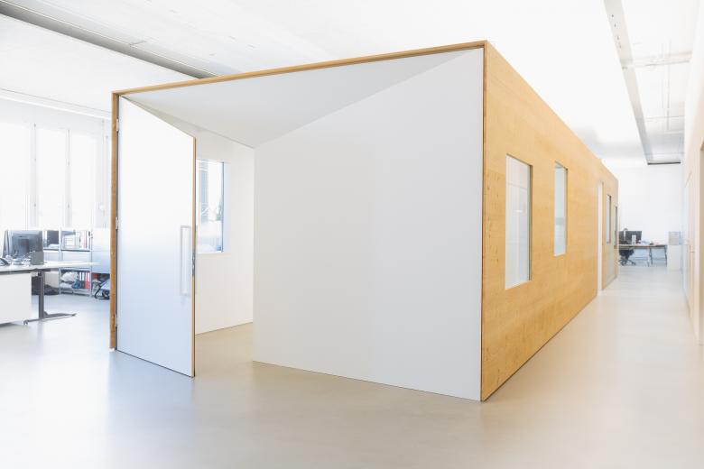 Im Gebäudeteil der Haslerstrasse realisierten wir 2015 im Auftrag der Elektroplaner HHM Bern AG deren Innenausbau. Ausgehend vom Ausdruck unseres Büros im Erdgeschoss setzten wir die gleichen, akustischen Deckenelemente ein und vergossen den Boden mit einem Ausgleichsbelag. Dem gegenüber stellten wir einen Raum-im-Raum für Sitzungszimmer und Kopierzone, verkleidet mit warmem Thermoholz aus Lärche. Diese Massnahme gliedert den Grossraum in differenzierte Bereiche, versetzte Öffnungen lassen unterschiedliche Aus- und Durchblicke zu. Der Abschluss des Baukörpers bildet beidseitig eine eigenwillige, gefaltete Türfront in Form eines Trichters, als Geste für den Zugang zu den Besprechungsräumen.