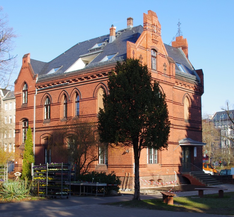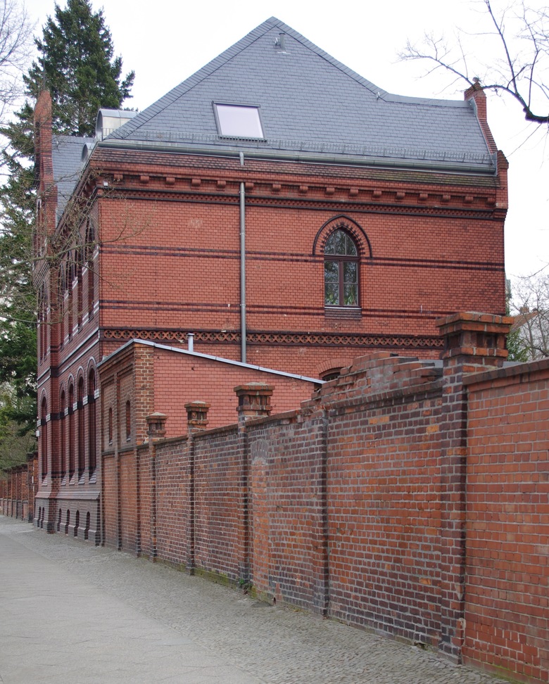 Das Verwalterhaus des Alten Luisenstädtischen Friedhofs, Baujahr 1892 befindet sich an der nördlichen Grundstücksgrenze des Friedhofes zur Strasse in direkter Flucht mit der Friedhofsumwehrung.
