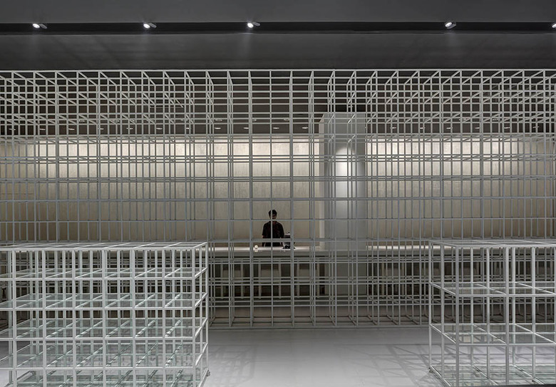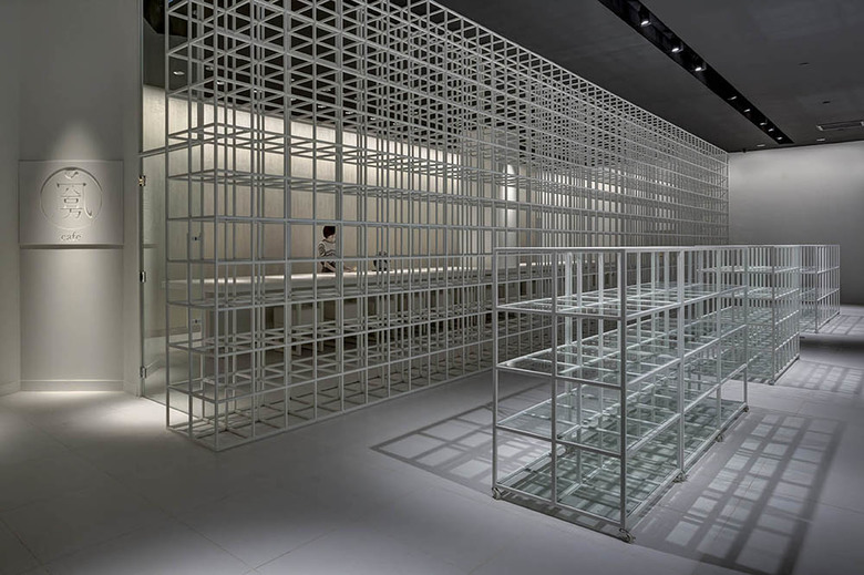 外側の通路からは、物販部分の什器はポイントで照射され、影のある物販スペース。その奥に物販とカフェを分ける格子のスクリーン。カフェの背後にある錫箔の壁面を均一に照らされた最も明るい面。