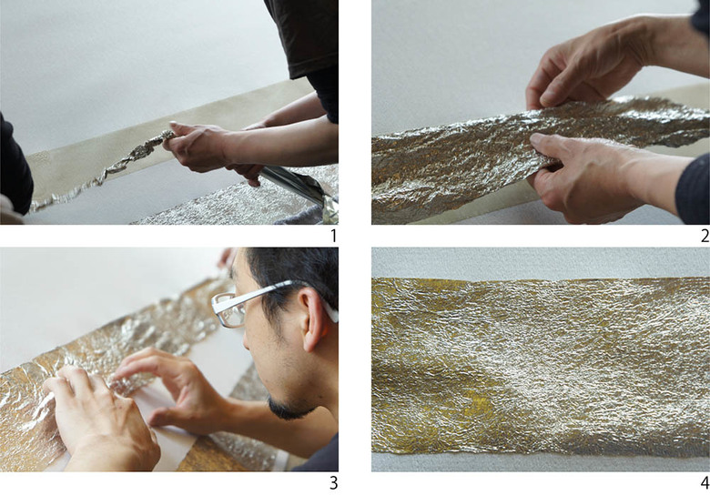 錫箔は日本で職人によって錫箔を手揉み加工、和紙で裏打ちしたものを製作し、それを輸送して現地でウォールペーパーを貼る要領で施工を行った。現地の職人でも日本の高度な空間表現を可能にしている。