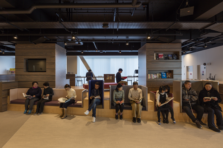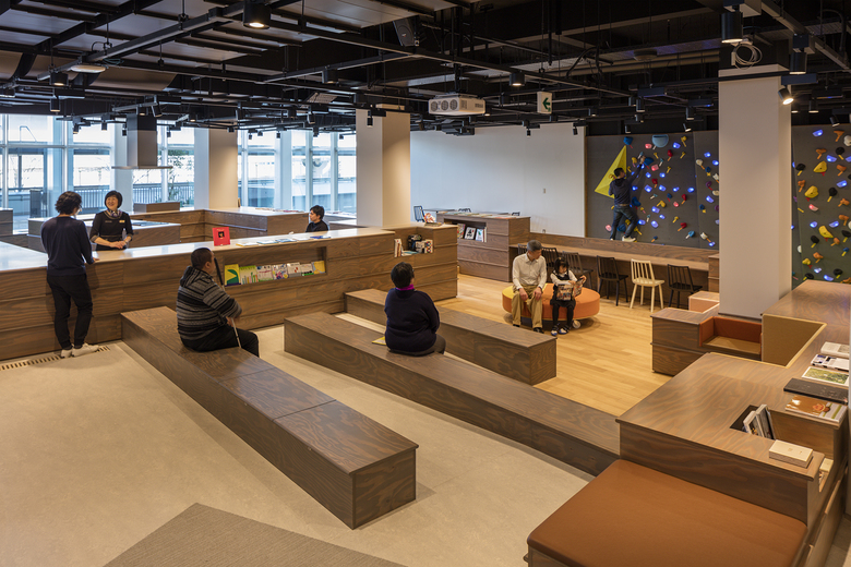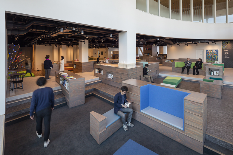 設計に際して、「目に障がいのある人の方が楽しめる空間」を目指すための試みとして、視覚に頼らずに空間を認知できるレイヤーを複数重ねた。一繋がりの家具を空間全体に巡らせ、見えない中心を生み出すこと。硬さや柔らかさの違うマテリアルを選び足裏で変化を感じ取ること。色の違いを使って、薄目で見ても領域の境が感じられる床を作ること。これらの、目に障がいを持った人の身体が拡張するような工夫を行った。見えないレイヤーの重なりは、振る舞いを見出すための地形のようなものであり、「思い思い」、「惚ける」、「打ち込む」といった様々な『居方』を生み出している。