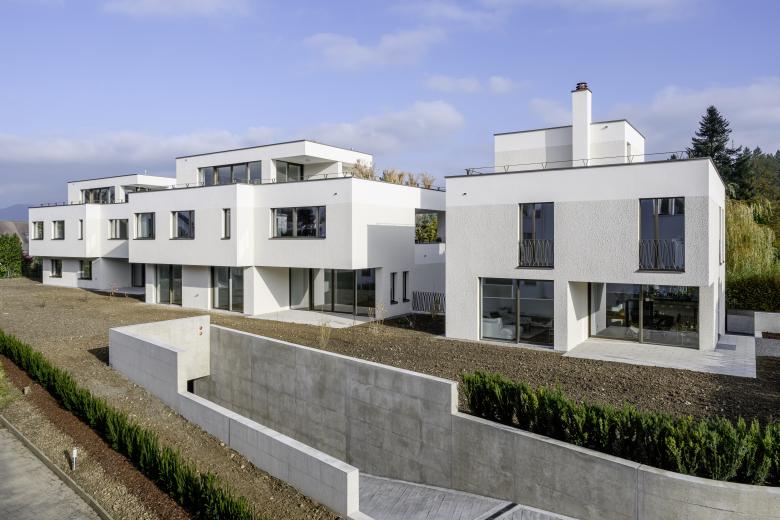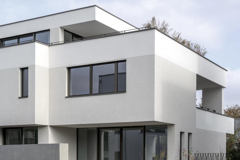 Ausgehend vom heterogenen Kontext und dem Bedürfnis nach Privatsphäre entwickeln sich die beiden zweigeschossigen Baukörper mit Attikageschoss über die horizontal getrennten Wohneinheiten.