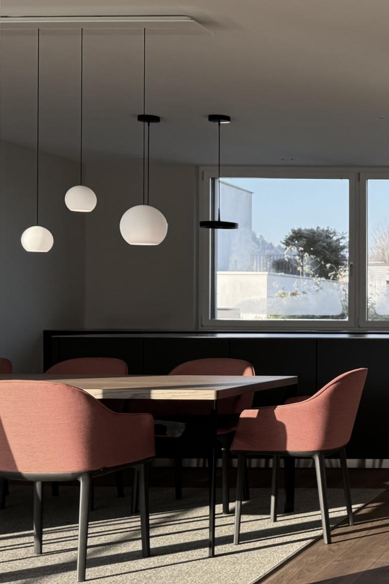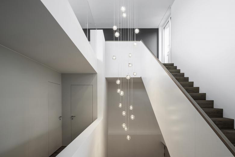 Das Split‐Level‐Konzept des Einfamilienhauses schafft reduzierte Erschliessungsflächen. Dadurch bleibt mehr Raum zum Wohnen. Es entstehen unterschiedliche atmosphärische Zonen mit differenzierten Raumqualitäten. Die Innenräume verwandeln die äussere Strenge in eine offene Wohnlandschaft, die sich zum Garten nach Westen öffnet.