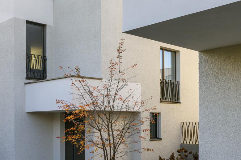 Die zurückhaltend, skulptural geformten Volumen erzeugen ein differenziertes Erscheinungsbild. Gleichzeitig tragen die abgestuften Fassaden zu einer grösseren Privatsphäre der jeweiligen Wohnseiten bei. Die Vor‐ und Rücksprünge der Fassaden sorgen für abwechslungsreiche Licht‐ und Schattenspiele.
