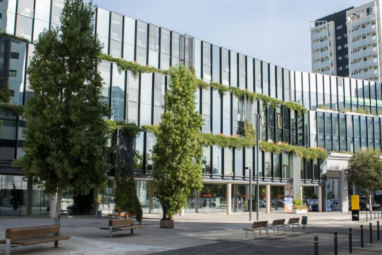 The building is located in the center of the new economic district of Hospitalet, in a complex whose main elements are luminosity and a close relationship with urban nature.