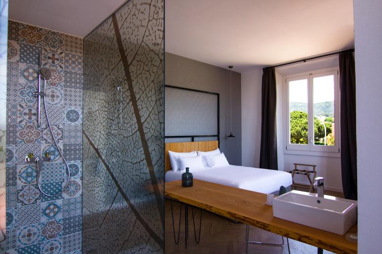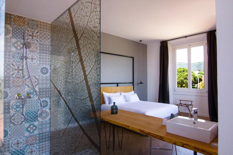 The structure of the beds is designed with a metal frame in which the headboard is made of the same wood as the rest of the elements. The same treatment is given to the mirrors and towel racks.