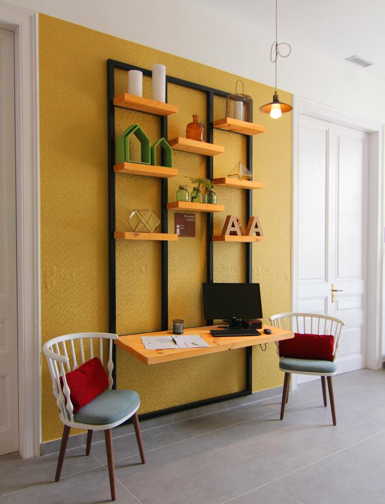 The most representative furniture of the common areas and rooms has been designed respecting the overall image of the hotel. For the tables and bathrooms, natural wood is used on a varnished metal structure.