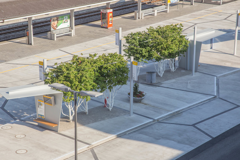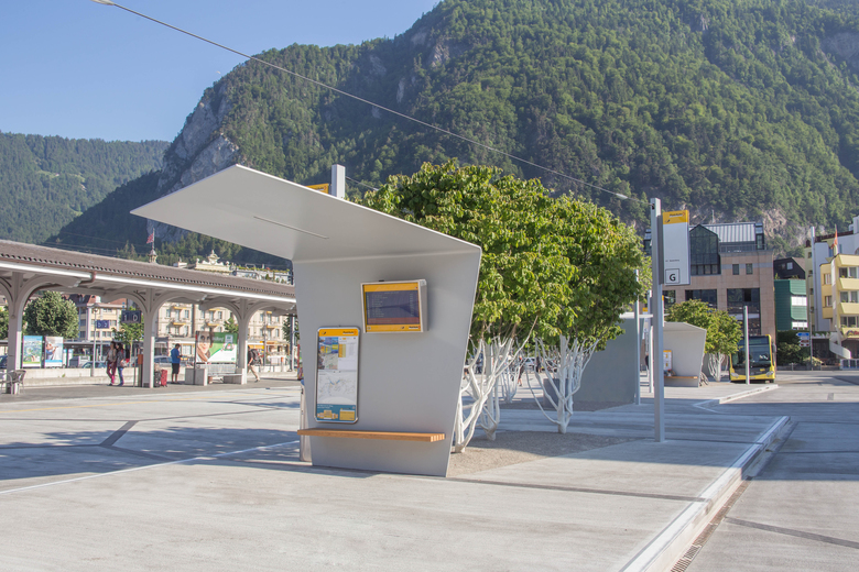 Die Funktion vom Busbahnhof wird optimal sichergestellt, ohne den städtischen Freiraum thematisch zu dominieren. Den Bereich zwischen Geleisen und Bahnhofstrasse lesen wir als Übergang zwischen Bahn und Stadt, als Ort, wo sich der Reisende orientiert, informiert, ausrüstet, verpflegt oder einfach umsteigt. Um das auch gestalterisch ablesbar zu machen, haben wir den Bereich vor der Strassenkante bis zur Perronkante mit einem einheitlichen Belag versehen. An Ort betonierte Flächen, mit von den Gebirgsstrukturen abgeleiteten Formen, bespielen den ganzen Bereich wie Puzzleteile. Die Anlegekanten des Busbetriebs fügen sich selbstverständlich in das Muster ein. Die Platzmitte bildet das Busperron. Es ist möbliert mit vier kleinen Unterständen mit zugeordneten mittelhohen Baumgruppen und mit einer linear abgespannten Beleuchtung.