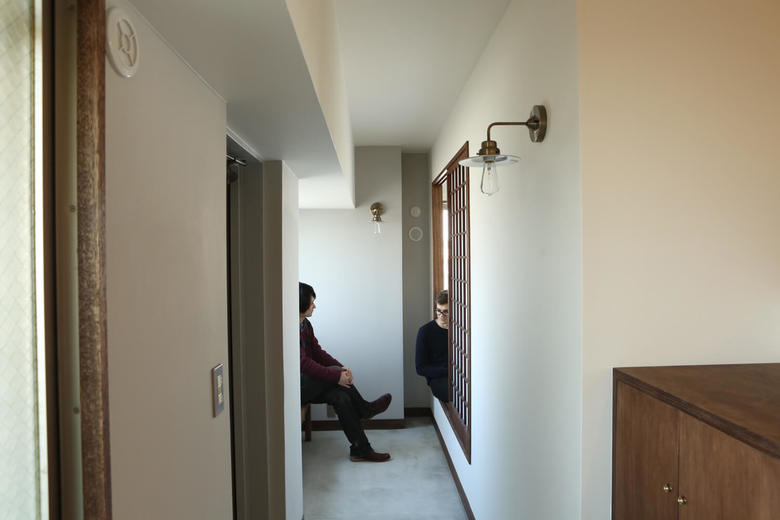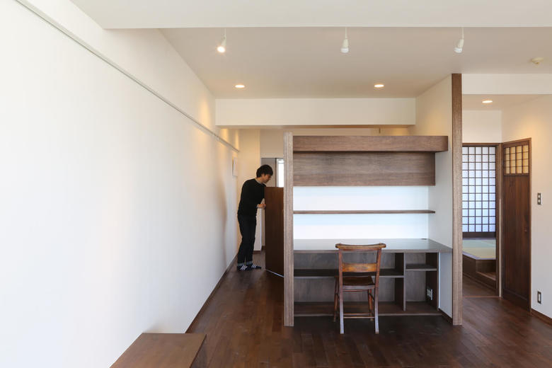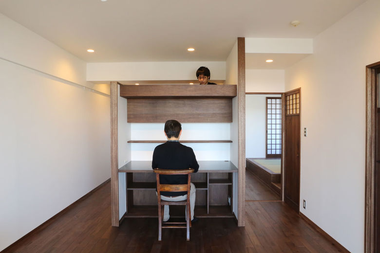 30代夫婦のための築16年マンションリノベーションです。典型的な3LDKの間取りから部屋数を減らし、広々とした1LDKの間取りへと再構成しました。 土間を区画の幅全体に広げ、玄関を大きくとりました。将来家族が増えるのに備えたロフトスペースは、下駄箱を兼ねた階段からアクセスできます。ロフトの下は、廊下、寝室から収納として利用でき、リビング側にはPC作業スペースと本棚を設けました。ベイバルコニーとキッチンに挟まれ手狭だった3.5畳のダイニングは、上げ床とし足を入れて座れるキッチンに面したカウンターを設けました。寝室は個室で、上げ床の畳の部屋としました。ふすまを開けると玄関土間につながる縁側となっており、ここで晩酌をしたり本を読んだりして就寝前にくつろぐことができます。 これらのスペースは、ロフトボックスを中心にループ状の動線で構成され、一つの空間の中に人の気配を感じられたり、プライバシーを確保できたり、住まいの中に様々な距離感を生んでいます。