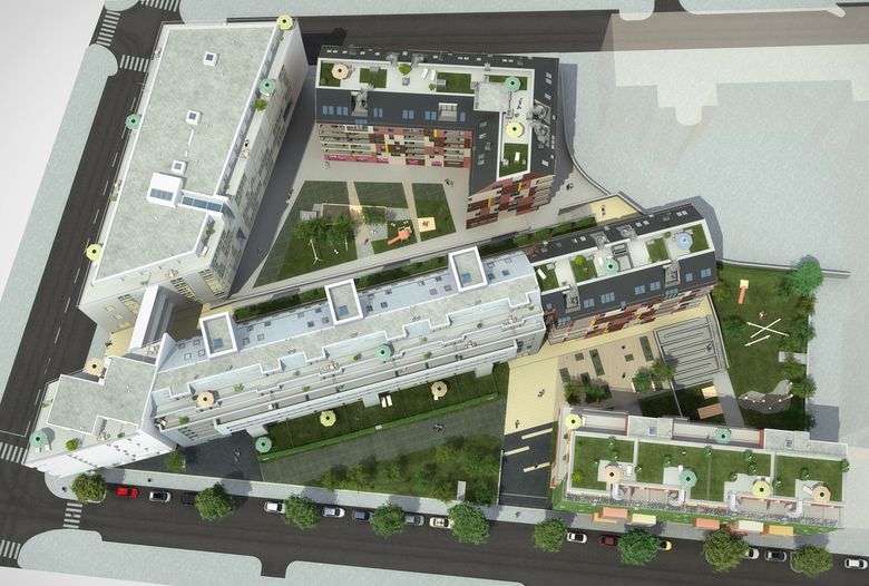 Die terrassierten Hofniveaus und belichteten Sockelzonen mit Wellnessbereichen, Spiel- und Fahrradräumen ergänzen den Freiraum und fungieren als Bindeglied der einzelnen Bauten. In den obersten Etagen befinden sich Wellnessbereiche mit Dachterrassen und intensiv begrünten Dachgärten. Die Fassadensprache ist von reliefartig entworfenen Verflechtungen geprägt. Die verglasten Flächen der Kinderwagen- und Fahrradräume, Waschküchen und Eingänge prägen die Leichtigkeit und Übersichtlichkeit der Anlage.