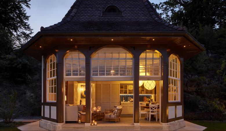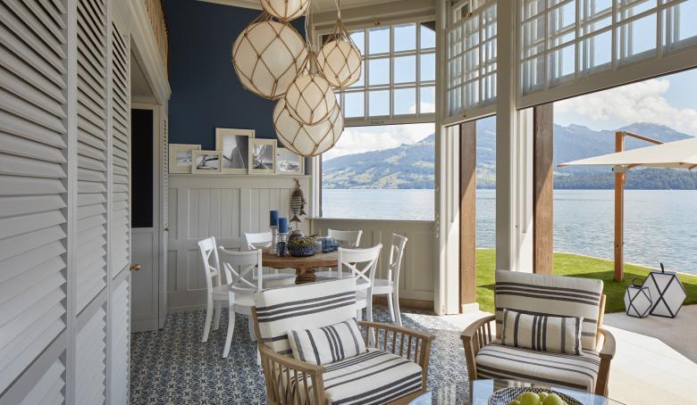Ein hundert Jahre alter Badepavillon, etwas versteckt am Ufer des Vierwaldstättersees gelegen, wurde mit grossem Respekt vor dem Bestand saniert. Dafür wurden unter anderem neue Fenster eingebaut, die mit gezogenem Glas bestückt wurden, um ihre Ausstrahlung zu erhalten. Das Interior Design spielt mit der Idee des Aufenthalts am und auf dem Wasser. Dazu bekam der kleine Pavillon ein Maximum an Funktionalität, so wurden eine kleine Küche und ein Badezimmer eingebaut. Der Boden ist mit Zementfliesen belegt; klassisch-elegante Holzmöbel schaffen eine gemütliche und doch kosmopolitische Atmosphäre. Die Leuchten spielen mit der Idee des Bootshauses und eine Künstlerin aus der Region gestaltete die Wanddekoration, die Fische des Vierwaldstättersees zeigt.