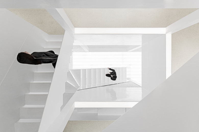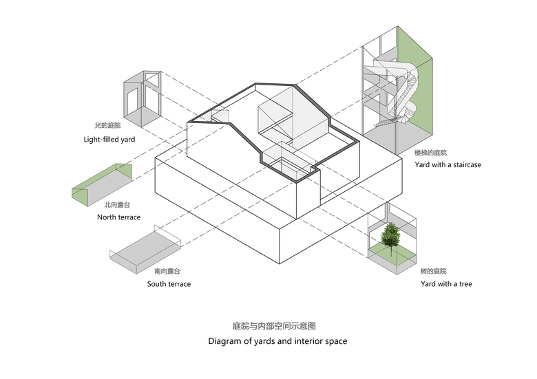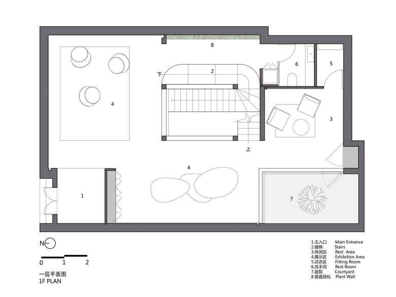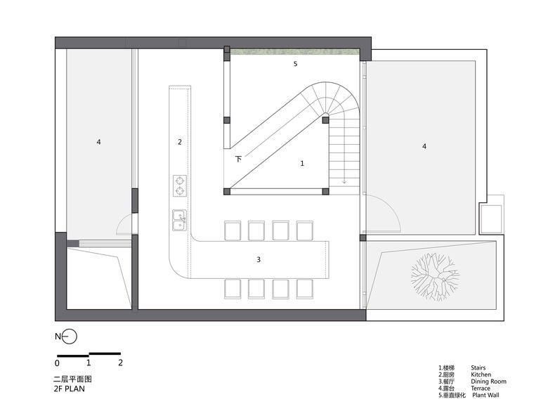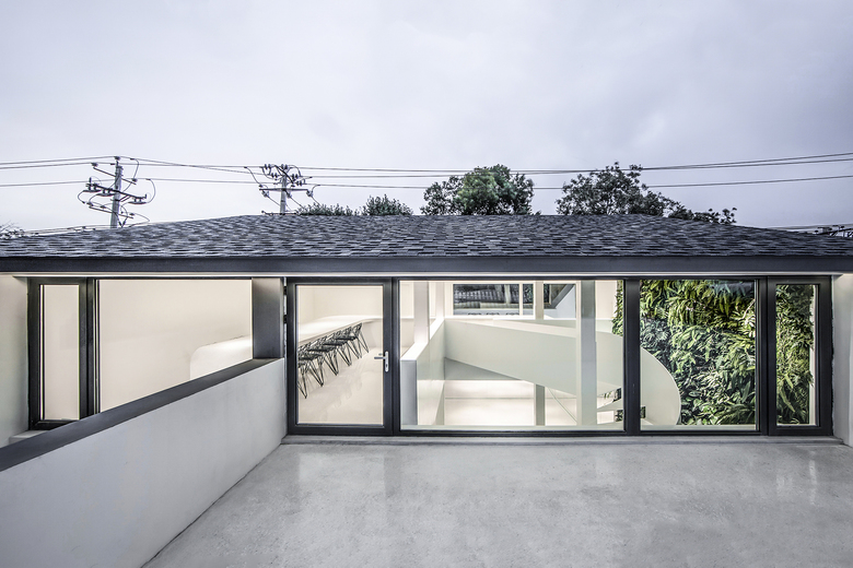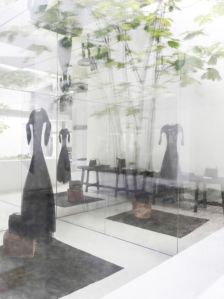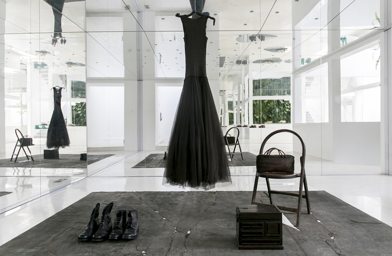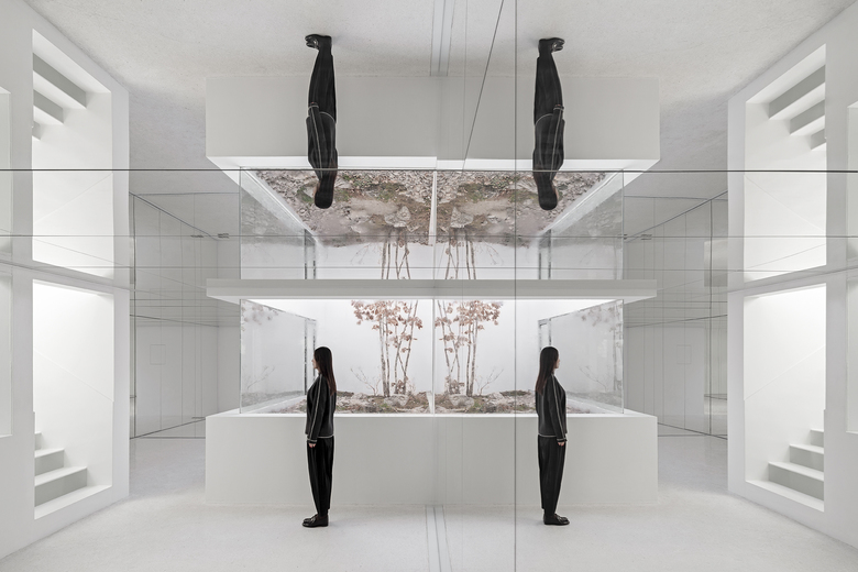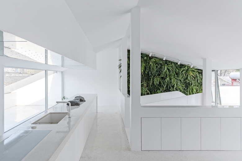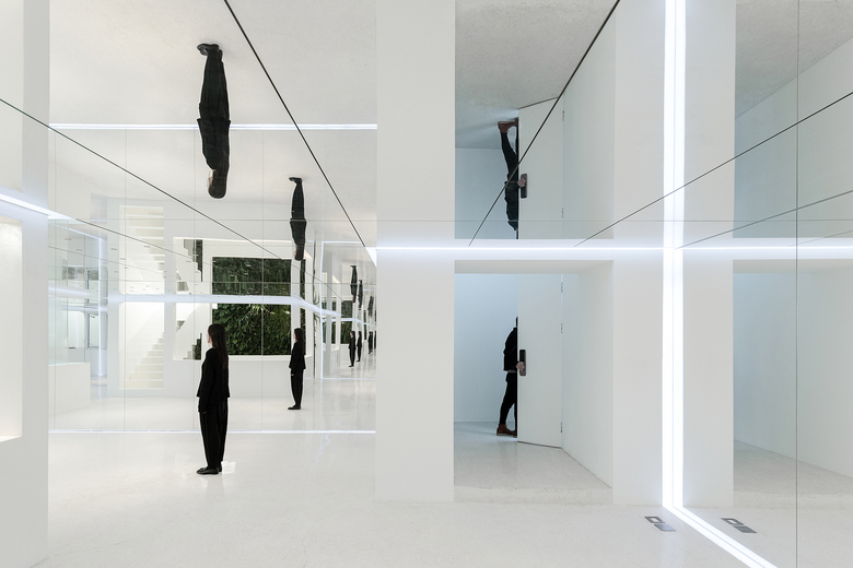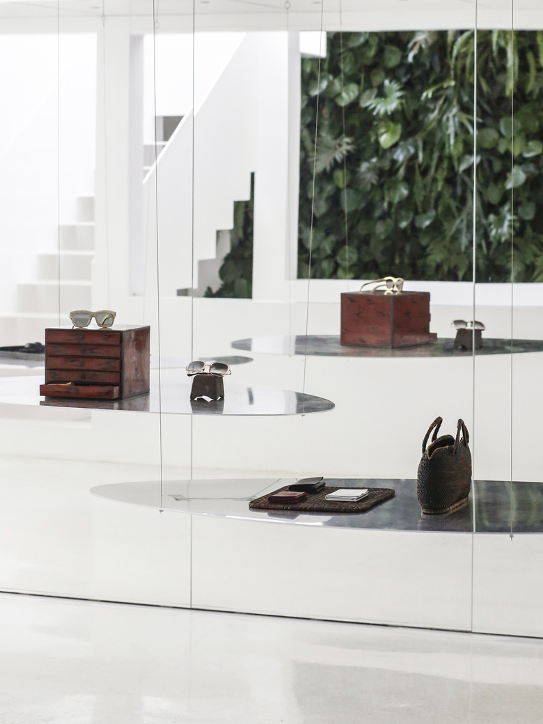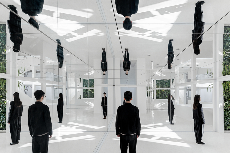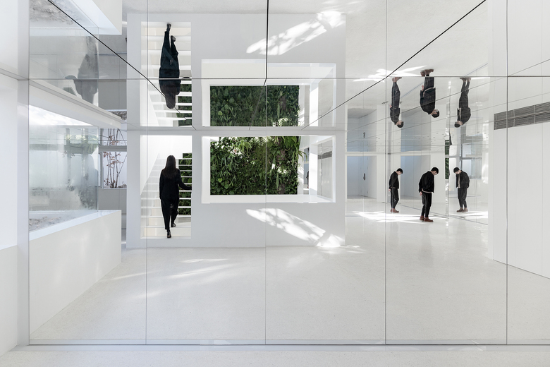 The main concept of the design is to build indoor-outdoor connections through mirrors and yards, so as to create infinite field of vision in the limited space and turn the architecture into a "garden" featuring diversified scenes and experiences. Three yards connect the interior spaces, and bring in ample sunshine and greenery. Walking through a daylight-filled yard, it arrives at the first floor, where furniture and some other products are displayed and sold. A large area of the space is finished with mirrors, which produce multiple reflections of people, objects, furniture and plants and generate an interactive relationship between the "real" and the "reflected". The staircase, complemented by a 6-meter-high vertical plant wall, zigzag upwards to the second floor, the attic. The kitchen and the dining table are constructed with terrazzo, together forming a "L" shape, which enables the close interaction between the chef and dinners. There are two terraces respectively situated on the north and south side of 2F, allowing indoor activities to be extended outdoors freely. The basement was repurposed into an area for displaying and selling garment, shoes and hats. The gleaming floor serves as the display stand for hats, shoes and other items, and also brightens the underground space. Well-selected clothes are hung in a mirror-filled space, which produces playful interaction between people and objects. The design team adopted an intelligent lighting system in the entire space, and embedded variable lights into mirror-clad spaces, with a view to meeting the needs for different activities and settings.