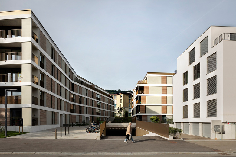 Aus eben dieser Zusammenarbeit resultierte die städtebauliche Entscheidung, dass eine Abfolge von Punkthaus, Bestand und Zeile die optimale Eingliederung des Ensembles an diesem Ort garantiert. Die klar strukturierten Gebäudezeilen wurden leicht gekantet und orientieren sich rechtwinklig zur Strasse. Durch diese Ausrichtung, verbunden mit der Kubatur der Häuser, entstehen fliessende Freiräume zwischen den Zeilen, die dem Wunsch nach einem grünen, dynamischen Quartier entsprechen.