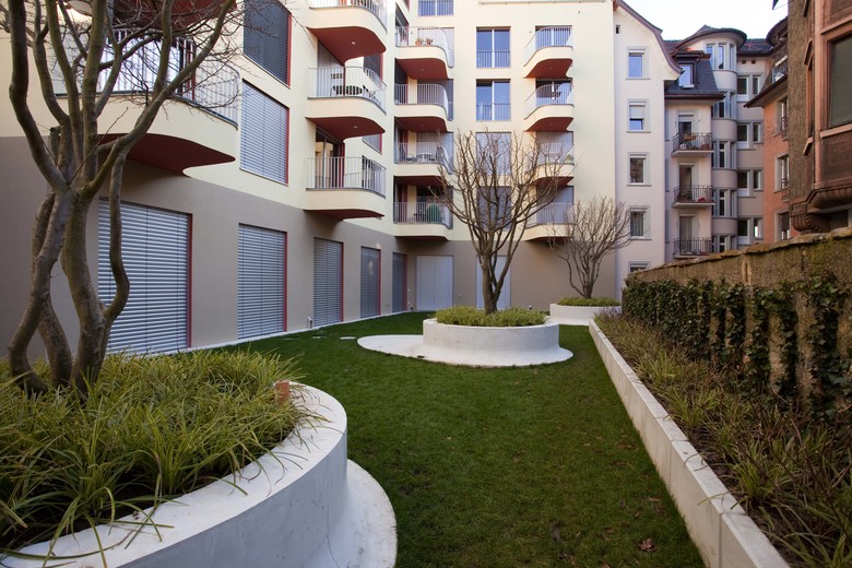 hingegen weist eine einfachere Gestaltung auf. Die Dreiteiligkeit wird nur noch angedeutet. Das Erdgeschoss wird in Sichtbeton materialisiert, jedoch ohne Profilierung. Der obere Attika-Abschluss ist nur noch eingeschossig. Die Qualität des ruhigen Innenhofes wird durch die sanfte und organische Formensprache der Fassade und des Gartens geprägt: Der Innenhof als einfachere, aber sinnliche Welt des Wohnens verstanden.