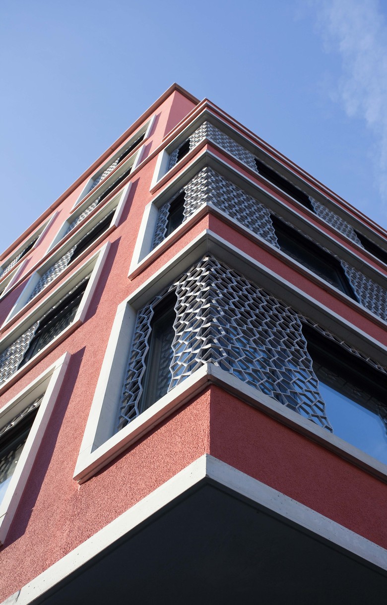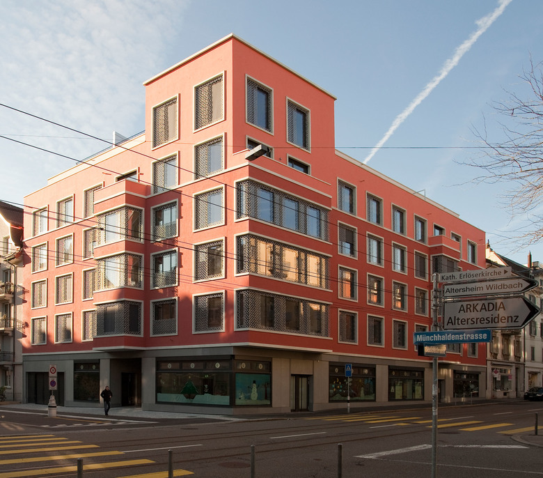 Die Identität des bestehenden Blockrandes wird in die Gestaltung miteinbezogen. Die klassische Dreiteilung der bestehenden Baukörper wird weitergeführt. Wie es sich für ein Eckgebäude gehört, wird die Attika subtil überhöht. Es wird zwischen Strassen- und Hoffassade unterschieden.