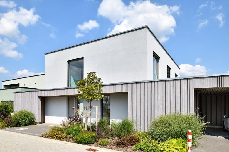 Den Auftakt bildet die den Straßenraum abschließende erdgeschossige Erschließungsspange für Vorzone mit Eingang, Lager und Garage, eingehüllt in eine stehende Lärchenschalung. Im Gartenbereich zurückgesetzt und so sichtgeschützt zum Strassenraum ist das zweigeschossige Wohnhaus platziert, jetzt mit verputzter Fassade.