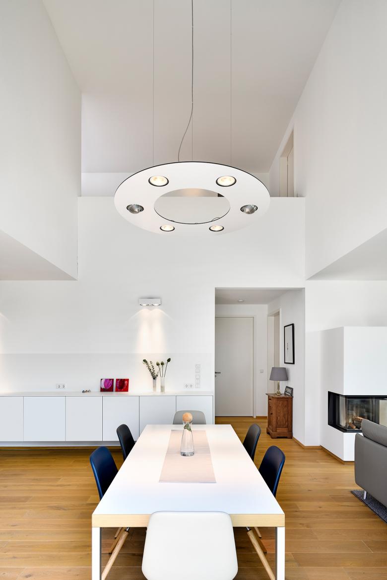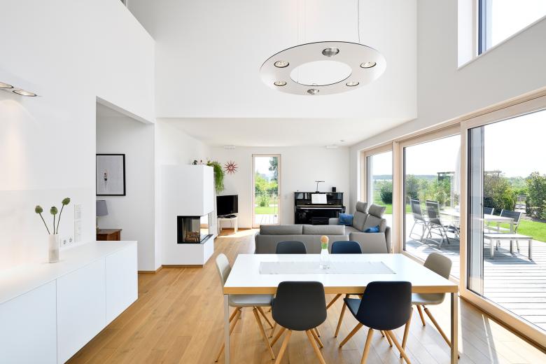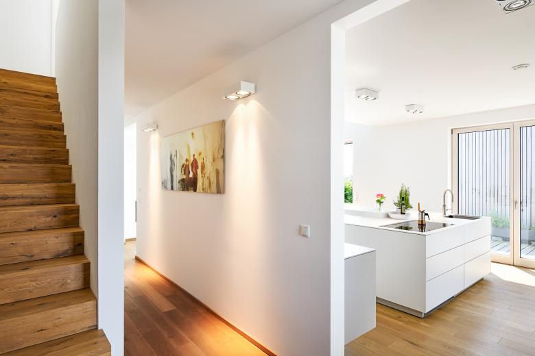 Die reduzierte Formensprache der Gebäudehülle wird im Innenraum fortgeführt. Hier dominieren Einbauschränke, weiße Wände, raumhohe Wandöffnungen und durchgehend einheitliche Bodenbeläge.