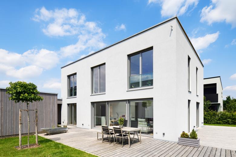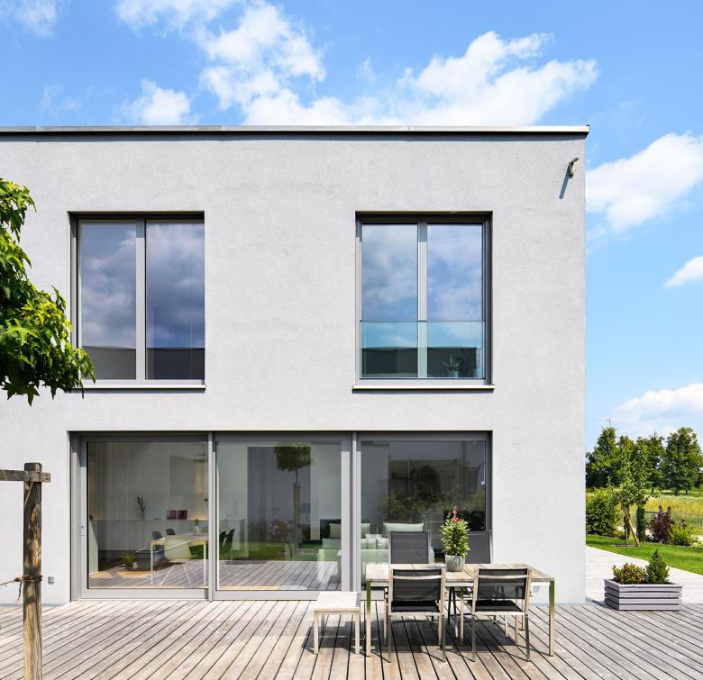 Zum Garten verknüpfen die Fensteröffnungen innen und außen, im Obergeschoss erfolgt die Anordnung der Öffnungen möglichst unter Vermeidung nachbarlicher Einblicke.