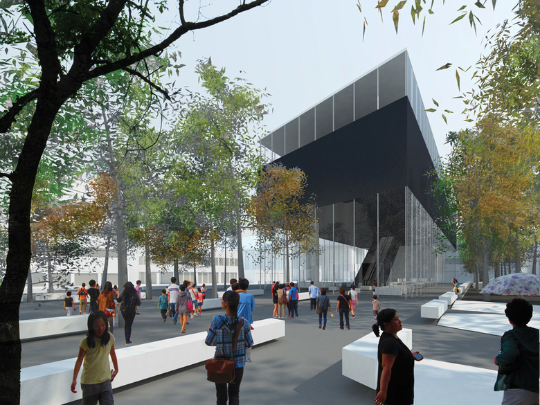 Be it for the inside sequence of spaces or for the outside overall appearance, the clear-cut organization of the building is uncompromising and easily legible: a cultural open lobby (extroverted), a closed library (introverted), an open lounge and children's library (extroverted). The black box contains what could be dubbed a "traditional library space", the core program of the building. It hovers 7 meters above ground in order to shelter the public lobby, the cultural multipurpose spaces, the amphitheater and the digital library on the ground floor. Softer types of library programs such as the lounge and the children's library are placed on top of the library in order to profit of a maximum of sunlight, tranquility and a 360 degrees panoramic view of the city around.