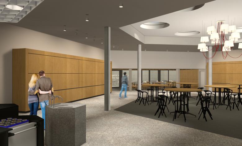 Wie um einen Marktplatz gliedern sich die drei Essens-Counter des food market an der ETH Zürich auf dem Campus Hönggerberg. Und wie Marktstände werden sie bei Betrieb geöffnet und zeigen sich im geschlossenen Zustand als schlichte Holzkuben. Der Platz, der in der Mitte entsteht, ist Begegnungsfläche und Imbiss-Bereich zugleich. Das abwechslungsreiche Mobiliar bietet mit verschiedenen Stühlen, Barhockern und Bänken unterschiedlichste Sitzformen und gliedert somit den Raum. Auch die Beleuchtung, die aus einer Kombination von auffälligen Pendelleuchten und funktionalen Leuchten besteht, sorgt für die Akzentuierung der verschiedenen Bereiche und lässt trotz der Grösse des food market eine behagliche Atmosphäre entstehen. Beim Umbau wurden denkmalgeschützte Elemente, wie das prägnante Deckenraster, erneuert und in die neue Gestaltung integriert.