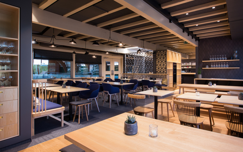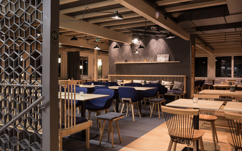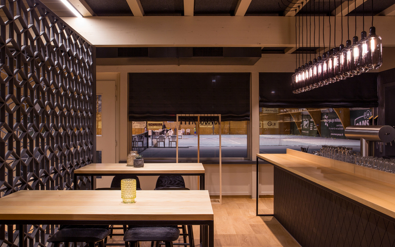 Das zur Tennishalle angrenzende Restaurant erstrahlt seit dem 15. Dezember 2018 in neuem Glanz und lädt auf 180m2 nicht nur nach dem Sport zum Essen und Verweilen ein. Der Entwurf im nordischen Stil hebt das bestehende Gebäude in Holzbauweise hervor und bietet 104 Sitzplätze. Der Bestand wurde grosszügig geöffnet und mit einem Teppich als Bodenwechsel eine Insel um die tragende Wandscheibe geschaffen. Die Rautenform wurde als gestalterische Neuinterpretation des Geflechts eines Tennisschlägers mittels hochwertigen Wandfliesen integriert. Die vertikale Erschliessung - der Treppenkern - wird mit einem perforierten Raumtrenner aus Rauten betont und so zum Blickfang. Die Raff-Vorhänge an den Fenstern in Richtung Tennishalle bieten die Möglichkeit die warme Lichtstimmung trotz ausgeleuchteter Sporthalle am Abend zu bewahren. Die Material- und Farbkombination aus Eichen- und Eschenholz, Messing, Anthrazit, Saphirblau und Honiggelb verleihen dem Raum in Kombination mit den geometrischen Formen eine spannende Atmosphäre, welche durch die warme Lichtstimmung verstärkt wird. Mit den unterschiedlich generierten Sitzgelegenheiten und den diversen saisonalen gutbürgerlichen Spezialitäten bietet das Restaurant Schlossfeld für jeden das passende Angebot.