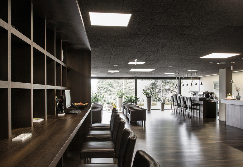 Ein kleines Hotel mit 40 Zimmern und großem Restaurantbereich, das den spröden Charme der 80er Jahre verströmt, soll in ein Modernes Hotel für Businessgäste umgebaut und auf 85 Zimmer erweitert werden. Die Zugangssituation mit Hotellobby, Frühstücks- und Seminarbereich wird dabei ebenso völlig neu gestaltet wie die Erschließung der Hotelzimmer. Da nahezu das gesamte Erdgeschoss des Gebäudes leer steht – ein großer Supermarkt ist abgesiedelt- kann in die bauliche Substanz großzügig eingegriffen werden. Bei der Auswahl der Farben und Materialien wird das Betreiberkonzept, welches die Regionalität in den Mittelpunkt rückt, maßgeblich miteinbezogen. Im Inneren des Hotels dominieren Brauntöne und edle Hölzer. Die Zimmer im Neubau sind komplett in Holz gehalten, dabei werden Wände und Decken in Weißtanne Massivholz ausgeführt, Möbel und Böden sind in Eichenholz gefertigt. Die Lobby ist ein großer, lichtdurchfl uteter Raum mit überhohem Eingangsbereich und vielfältigen Teilungs- und Nutzungsmöglichkeiten. Außen wird beim Neubau der Erweiterung Wert auf naturbelassenes Nadelholz gelegt, wogegen der Bestand eine Aufwertung durch eine neue, an die Farben des Inneren angelehnte Farbgestaltung erhält.