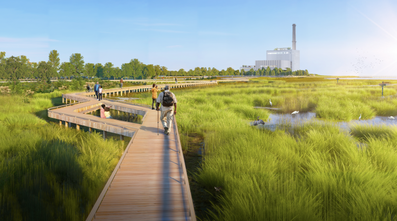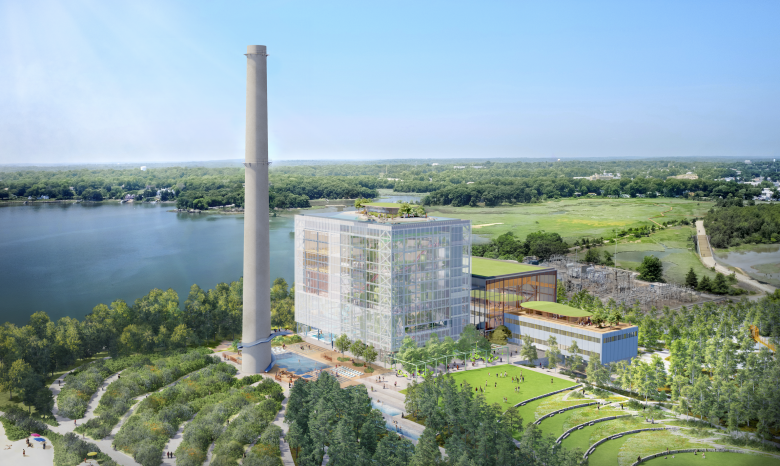 Manresa Island is situated on the site of a decommissioned power plant in Norwalk, Connecticut. The industrial peninsula, surrounded by water on three sides, will be transformed into a 125-acre publicly accessible park and destination with diverse year-round public programs, unlocking 1.75 miles of waterfront access for the first time in nearly 75 years. BIG was commissioned to preserve and adapt the plant’s main structures: the 22,000-sq-ft boiler building; the 22,000-sq-ft turbine hall; the 8,200-sq-ft office building; and the 350-ft-tall smokestack. Through adaptive reuse, these will be reimagined into a network of event spaces, educational and research facilities, and areas for play.